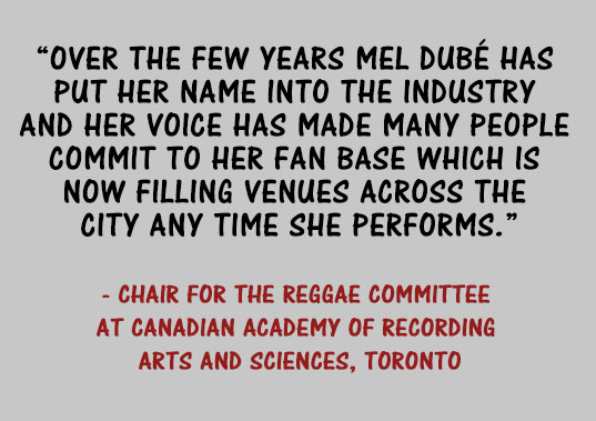 Independent artist, Canadian born Mel Dubé is trained in music theatre and fuses powerhouse vocals alongside her Jamaican heritage to inspire her soulful reggae appeal. Her first international release single “Extra Side” was chosen to be featured on Music 311 – a new phone system initiative managed by the City of Toronto connecting her music with millions of listeners in her hometown.